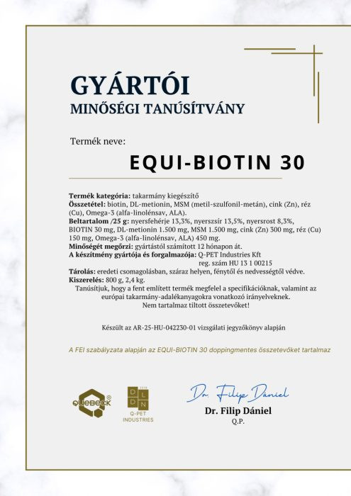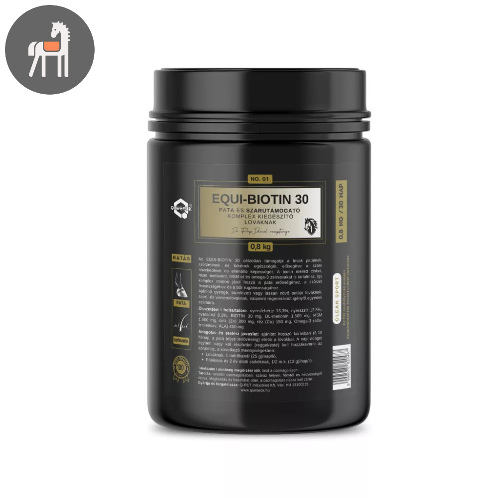 800 g EQUI-BIOTIN 30 kiegészítő elegendő kb. 24 nap etetésre, egy átlagos 500 kg-os lónak.
