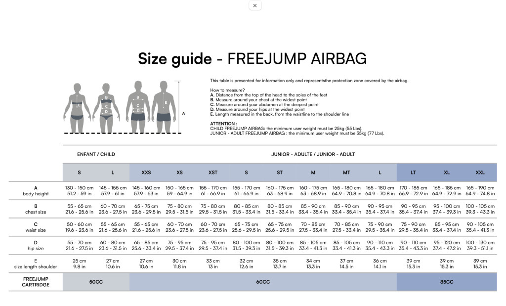 A FREEJUMP AIRBAG gyermekméretekben S és L, felnőttméretekben XXS-től XXL-ig kapható, az XS-től L-ig terjedő méretekben kétféle változatban: normál vagy hosszú (a méretben „T” jelöléssel), hogy még a magasabb testalkatúaknak is tökéletesen illeszkedjen. Például a hosszú változat XS mérete XST jelöléssel van ellátva.