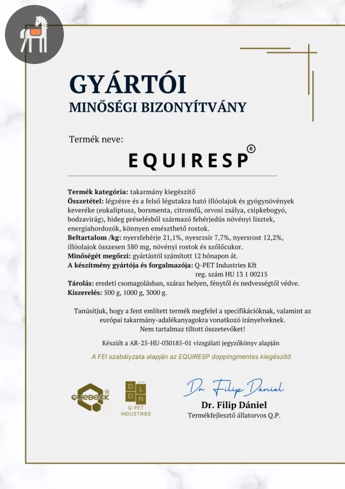 EQUIRESP nem minősül gyógyszernek, a receptúra gondosan összeválogatott gyógynövények, illóolajok és antioxidánsok hatására épül, hogy természetes úton, gyógyszermentesen javítsa a lovak légzési funkcióit és általános közérzetét. A felhasználói visszajelzések alapján a termék az egyik legkedveltebb a kategóriájában, és számos lovas tapasztalta, hogy már néhány nap használat után látható javulást hoz.