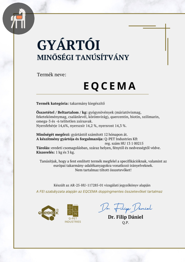 1 kg EQCEMA kb. 25 napi adagot tartalmaz egy 500 kg-os ló esetében.